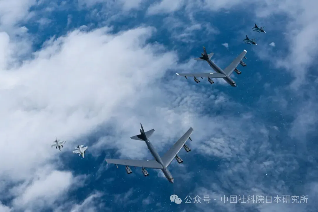 2025年7月11日,日美韩在韩国济州岛南部公海上空举行联合空中演习,美战略轰炸机B-52H参与。